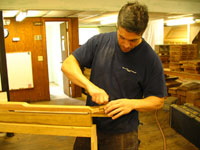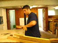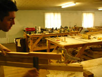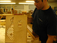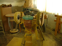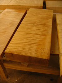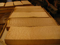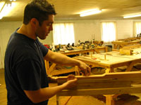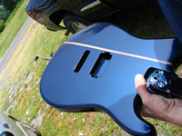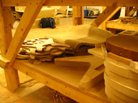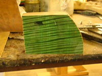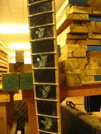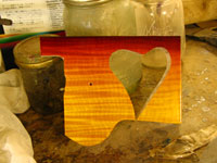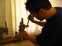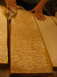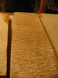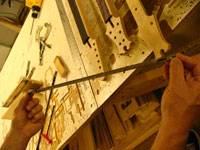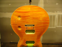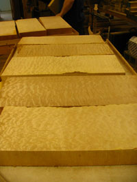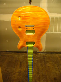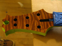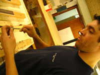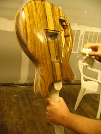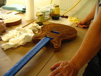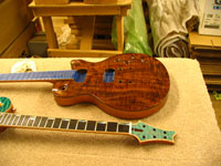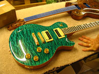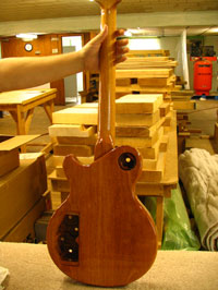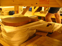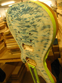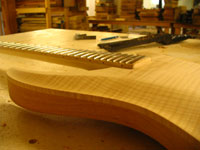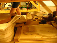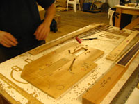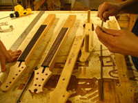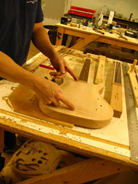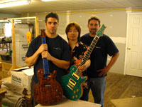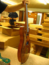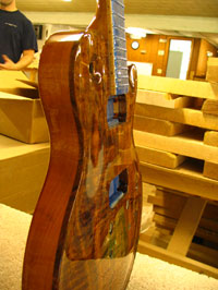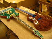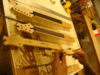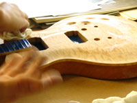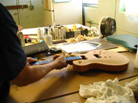 ボディの削りだしからインレイワーク、塗装、すべてをこの二人の職人が手作業で行なっており、その技量と精度には目を見張るばかりでした。